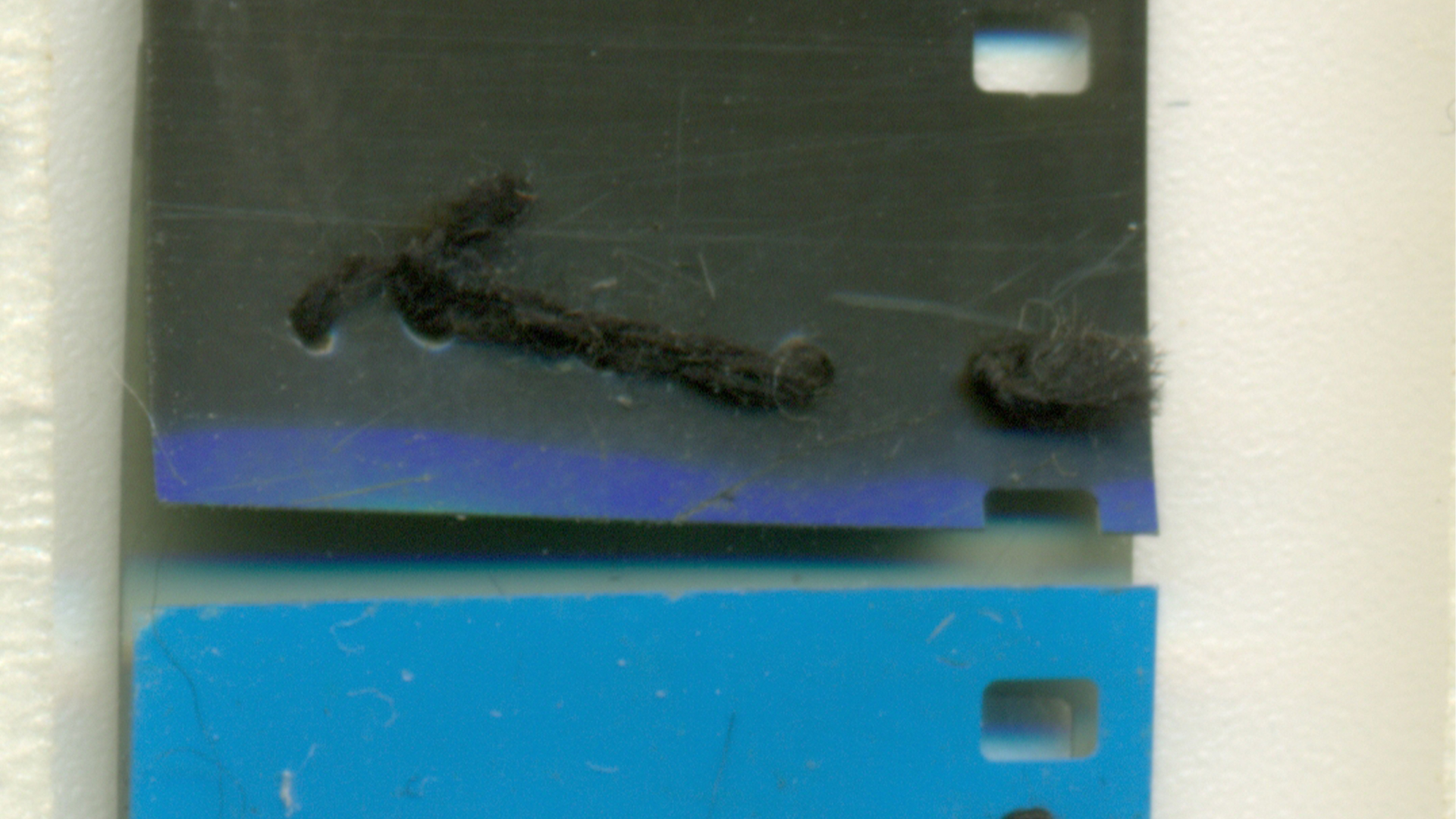 «Descartes Lav – 16mm» is a piece of audiovisual craftsmanship that mixes the film medium with the textile medium. Scraps of 16 mm film were sewn with black cotton thread, returning meaning to these pieces of celluloid scattered throughout the space of a laboratory. Emphasis is placed on the materiality of the films to the detriment of their content. This piece follows the investigation of the use of textile techniques, processes and materials in film practices. Many of them are analogous to working with textiles.