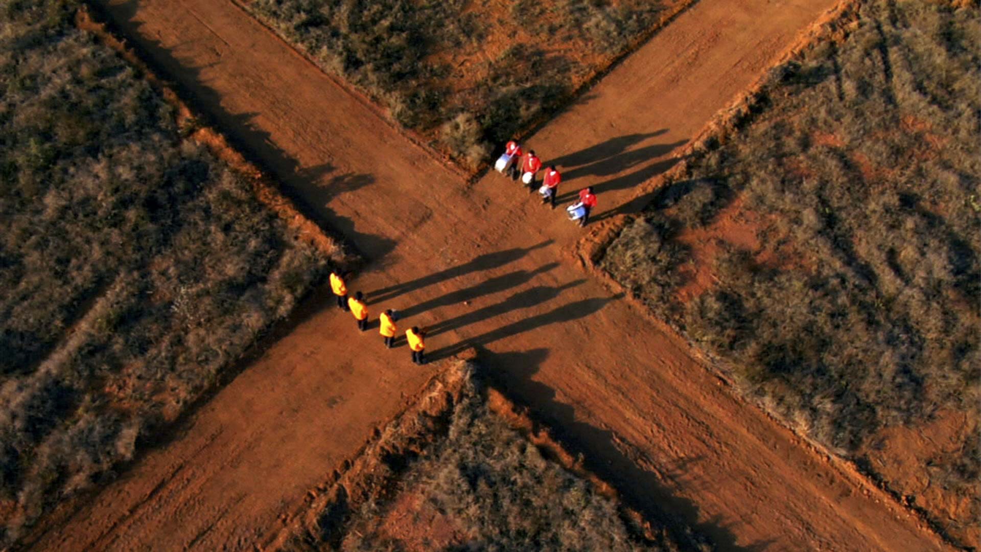 Una banda de música desfila por un cruce de caminos.