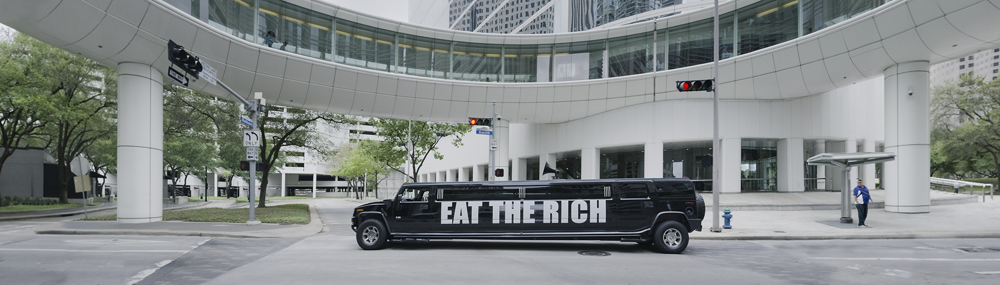 The opera begins in an abstract moment, with the hum of distortion and near-psychedelic patterns drawn across the screen. It is, in fact, the first protagonist of the film, a Humvee stretch limousine emerging from the longest carwash in the world, where, true to its spectacular scale, there is a spectacular performance of mechanized labour, with multicoloured lights and dyed soaps and detergents that wash over this gigantic and deformed facsimile of the vehicle so popular with American ‘Patriots’. As the Limousine departs, it embarks on a journey into Downtown Houston sweeping past billowing US Flags and gigantic infrastructure projects of the last century. As the scene plays out the significance of this tour of Houston is revealed, written on either side of the limousine in large bold letters are the phrases ‘EAT THE RICH’ and ‘KILL THE POOR’, the potency of this gesture is revealed as the vehicle cruises by the most affluent locations in Houston through to the sites of its most extreme deprivation. The diametrically opposed messages on the limousine get equally extreme responses from the people of Houston, from near elation at the sight of ‘EAT THE RICH’ to visible rage at the sight of ‘KILL THE POOR’. Within the vehicle is Amanda, a character of inherited wealth who lectures musically on the virtues of work from the safety of this provocative gilded limousine. Her beautiful but offensive song emanates through a loudspeaker mounted on top of the vehicle. In her apparent hubris and inherited entitlement, she chides the poor for their inept contribution to the economic system and cheers for their eradication.
