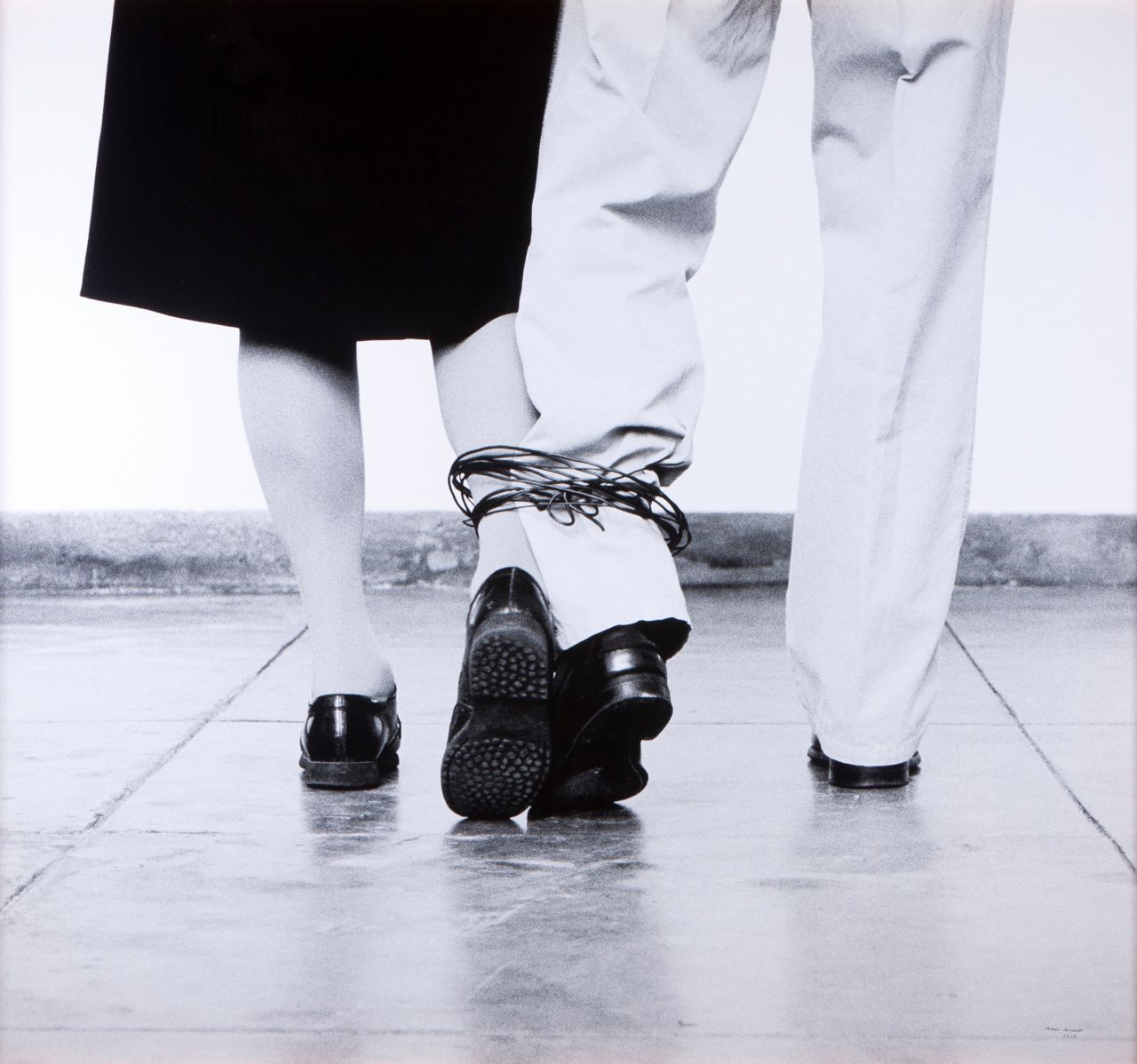 «Sin título» (…) trata del camino que recorren la artista y su marido en el estudio, atados a las piernas por un cable. La celebración del amor, pero también del esfuerzo, parece patente en la dificultad de moverse entre ellos, donde el camino recorrido se convierte en un calvario interminable. (Galería Filomena Soares)