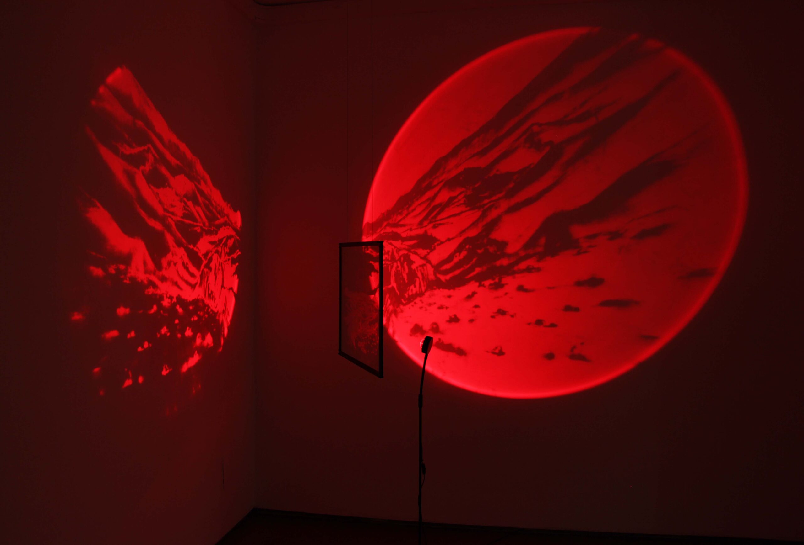 The title of this piece, Splitscape, is based on the fictitious meaning that comes from the combination of two English words: Split (cut, fissure; composition of an element with two parts) + Scape (Middle English –ship: state or condition of being; relationship between two elements; Dutch –skap; –shape, cut, shape). Thus, Splitscape proposes a certain way of observing the features of a territory that can be seen in two different ways from one place. There is a suggestion of a splitted landscape, as in a divided or double landscape, or rather a point of view with a double perspective on the same scenery. This installation consists of a landscape drawing made upon the mirror by scratching its surface and removing the thin silver layer. A spotlight, casting a red ellipse, is placed near the mirror producing two images as described below. The image projected on the left is the shadow of the silver remains (the red-light beam passes through the transparent glass). The image projected on the right is caused by the deflection of the red-light beam, which is repelled by the residual portions of silver on the surface. As a result of this splitting of the light beam, both images function as the positive and the negative of the drawing on the mirror. The mirror-screen is no longer a receptacle of images, nor is a shield that repels images, but a filter that also produces images. The cut, the interruption, often appear in my work as a way of relating two elements, two situations, or two different moments in time, as if it could offer the possibility to split and suspend our convictions (as well as time itself) in order to look for layered meanings. Splitscape depicts two points of view upon a landscape, in order to find a latent meaning waiting to be revealed, or rather a fictional meaning that offers a utopian or constructed alternative about a given experience.