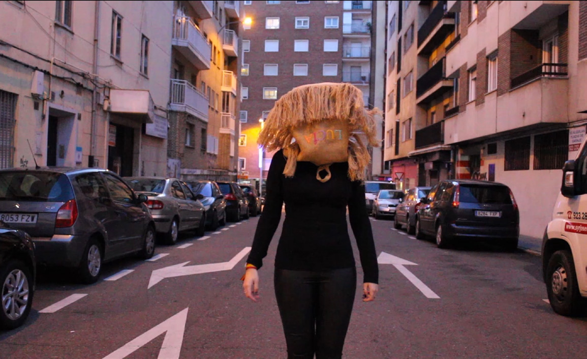 Series de tres imágenes de una persona en el centro de la imagen, alternándolas en base a la distancia en la que esta figura se encuentra del objetivo de la cámara. El personaje situado en las imágenes se muestra con objetos distintos cubriendo su rostro y cabeza. un póster, un bolso, una sartén, un cojín, una toalla, una tablet con una imagen, una caja, un espejo y una bolsa.