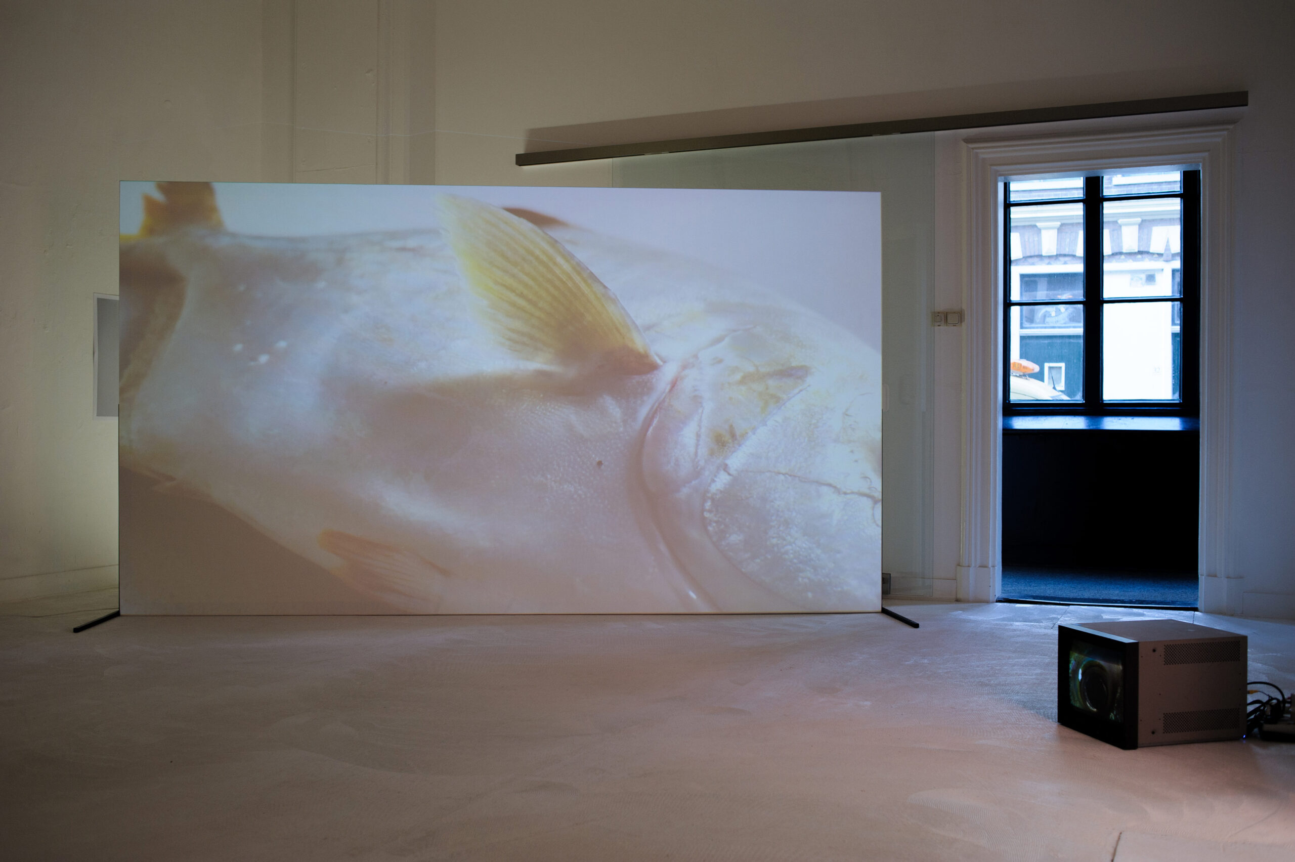 En el budismo, el cuerpo existe en forma de carne y finalmente se convertirá en tierra después de la muerte. Tengo curiosidad sobre el momento exacto en que una vida se va. Filmé al pez moribundo que tiritaba y su ojo. Los videos en bucle no manifiestan el límite entre la vida y la muerte, sino que congelan al pez eternamente en el tiempo entre morir y regenerarse. El pescado finalmente se diseccionó en partes en bolsas de plástico y se consumió al final. Usando el pez como metáfora, mi trabajo intenta revelar la alienación de los humanos de la naturaleza y otras especies. También deconstruye el verdadero significado de la muerte además de los sentidos de compasión e indiferencia. Al yuxtaponer los bucles de imágenes en movimiento y la imagen fija, exploro aún más la posibilidad y la limitación de los medios tradicionales y cómo los medios se connotan como el mensaje.